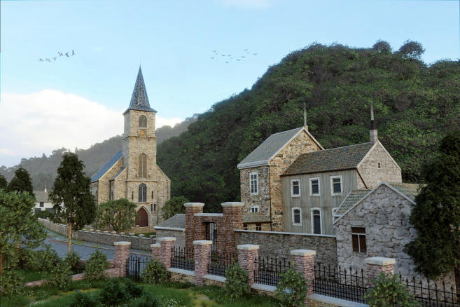 1849. Rechts daneben das Pfarrhaus aus dem Jahr 1851